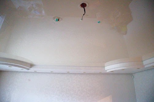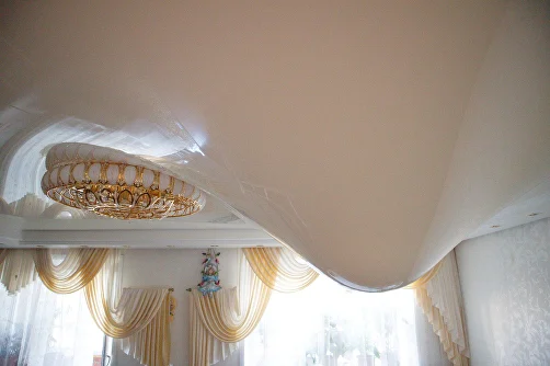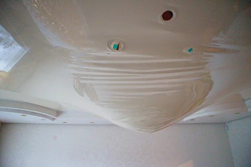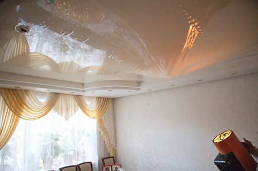 - обесточить квартиру; - сделать четкие снимки для страховой или управляющей компании; - вызвать специалистов из компании «Мастер слив». Нельзя прокалывать провисший пузырь натяжного потолка — материал начнет рваться, и вся вода хлынет в комнату. Не рекомендуется перекатывать пузырь в другое место, а также задевать его стремянкой и дверцами шкафов.